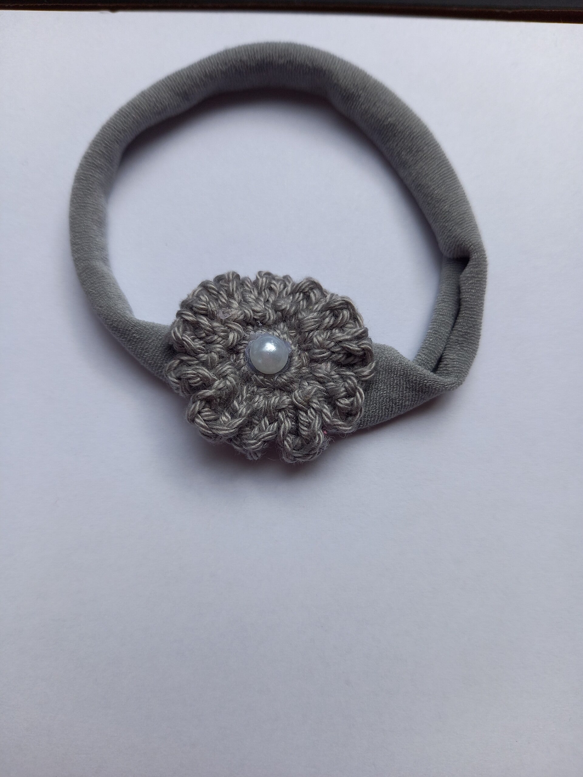 Een grijs kleur nylon haarbandje met een grijs bloemetje