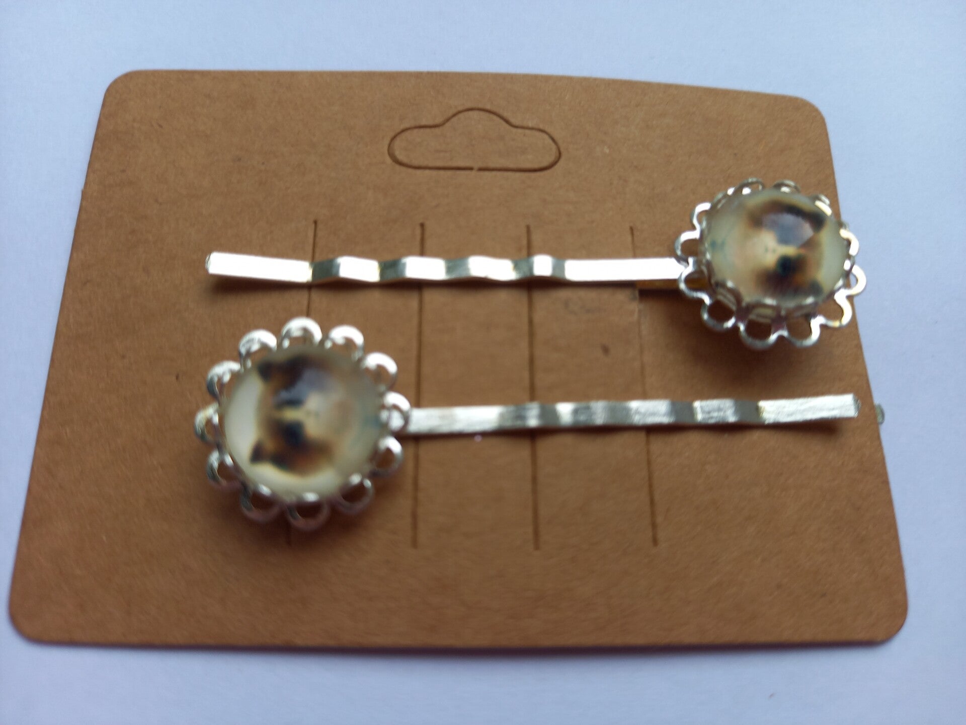 2 zilvere haarschuifjes met een poesje als plaatje erop